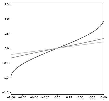 import numpy as np import matplotlib.pyplot as plt from astropy.modeling.models import ArcSine1D plt.figure() s1 = ArcSine1D(amplitude=1, frequency=.25) r=np.arange(-1, 1, .01) for amplitude in range(1,4): s1.amplitude = amplitude plt.plot(r, s1(r), color=str(0.25 * amplitude), lw=2) plt.axis([-1, 1, -np.pi/2, np.pi/2]) plt.show()