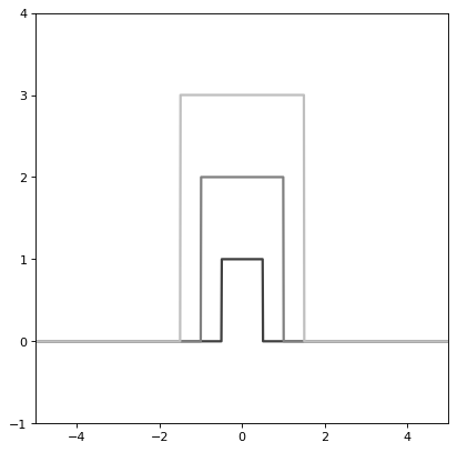 import numpy as np import matplotlib.pyplot as plt from astropy.modeling.models import Box1D plt.figure() s1 = Box1D() r = np.arange(-5, 5, .01) for factor in range(1, 4): s1.amplitude = factor s1.width = factor plt.plot(r, s1(r), color=str(0.25 * factor), lw=2) plt.axis([-5, 5, -1, 4]) plt.show()