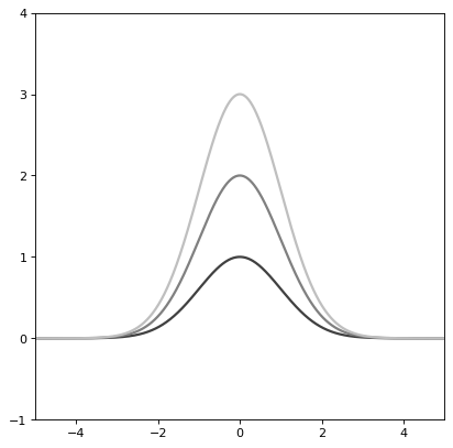 import numpy as np import matplotlib.pyplot as plt from astropy.modeling.models import Gaussian1D plt.figure() s1 = Gaussian1D() r = np.arange(-5, 5, .01) for factor in range(1, 4): s1.amplitude = factor plt.plot(r, s1(r), color=str(0.25 * factor), lw=2) plt.axis([-5, 5, -1, 4]) plt.show()