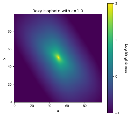 import numpy as np from astropy.modeling.models import GeneralSersic2D import matplotlib.pyplot as plt x, y = np.meshgrid(np.arange(100), np.arange(100)) mod = GeneralSersic2D(amplitude=1, r_eff=25, n=4, x_0=50, y_0=50, c=1.0, ellip=0.5, theta=-1) img = mod(x, y) log_img = np.log10(img) fig, ax = plt.subplots() im = ax.imshow(log_img, origin='lower', interpolation='nearest', vmin=-1, vmax=2) cbar = fig.colorbar(im, ax=ax) cbar.set_label('Log Brightness', rotation=270, labelpad=25) cbar.set_ticks([-1, 0, 1, 2]) plt.title('Boxy isophote with c=1.0') plt.xlabel('x') plt.ylabel('y') plt.show()