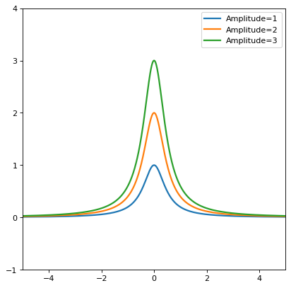 import numpy as np import matplotlib.pyplot as plt from astropy.modeling.models import Lorentz1D plt.figure() s1 = Lorentz1D() r = np.arange(-5, 5, .01) for factor in range(1, 4): s1.amplitude = factor plt.plot(r, s1(r), lw=2, label=f'Amplitude={factor}') plt.axis([-5, 5, -1, 4]) plt.legend() plt.show()
