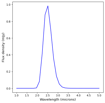 y = np.exp(-0.5 * (x - 2.5 * u.micron)**2 / (200 * u.nm)**2) * u.mJy