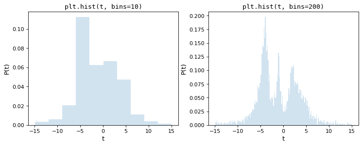 为此,考虑以下两个柱状图,它们是从5000个点的同一个基本集合中构造的,第一个柱状图使用matplotlib的默认值10个箱子,第二个柱状图具有任意选择的200个箱子: