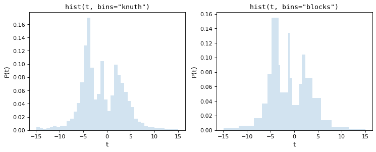 请注意,这两种方法都非常准确地捕捉了分布的形状,并且 bins='blocks' 面板选择宽度随数据中的局部结构而变化的库宽度。与标准默认值相比,这些贝叶斯优化方法提供了一种更原则的方法来选择直方图分块。
