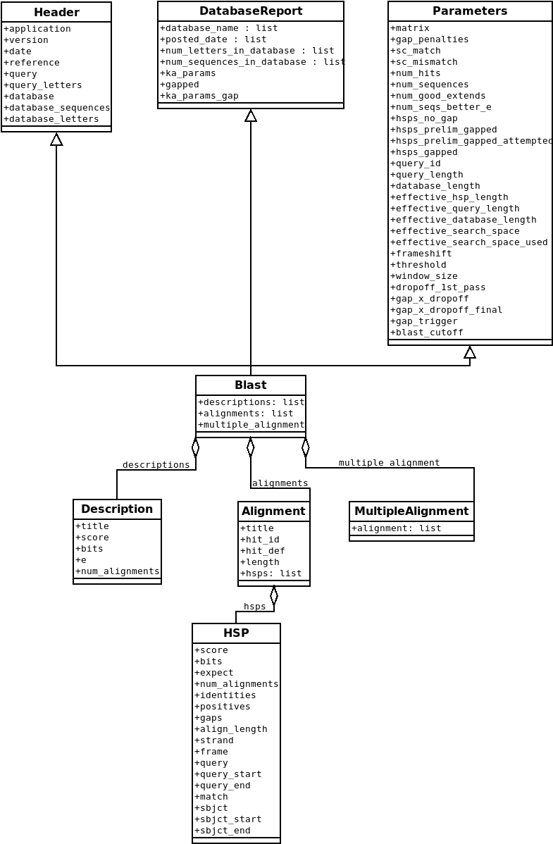 图 表示BLAST报告的Blast Record类的类关系图。 和 PSIBBlast Record类的类图。 这是我对 Blast 和 PSIBlast 记录课程。PSIBlast记录对象类似,但支持PSIBlast迭代步骤中使用的轮。