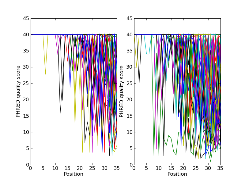 如果您正在使用第二代测序数据,您可能需要尝试绘制质量数据。以下是一个使用两个包含成对末端读取的FASTQ文件的示例, SRR001666_1.fastq 对于向前读,以及 SRR001666_2.fastq 对于相反的阅读。这些内容是从ENA序列读取存档的RTP网站(ftp://www.example.com和ftp://ftp.sra.ebi.ac.uk/vol1/fastq/SRR 001/SRR 001666/SRR 00166_2.fastq.gz)下载的,来自ftp.sra.ebi.ac.uk/vol1/fastq/SRR001/SRR001666/SRR001666_1.fastq.gz E. coli - 详情请参阅https://www.ebi.ac.uk/ena/data/view/SRR001666。