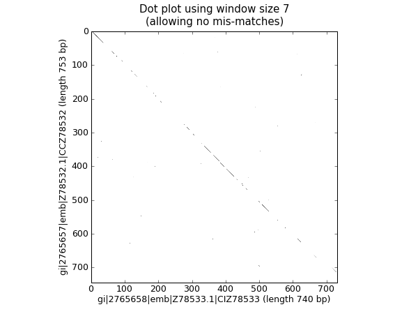 点图是一种直观比较两个碱基序列彼此相似性的方法。滑动窗口用于将短子序列相互比较,通常具有不匹配阈值。为了简单起见,我们只寻找完美匹配(中以黑色显示 图 24 ).