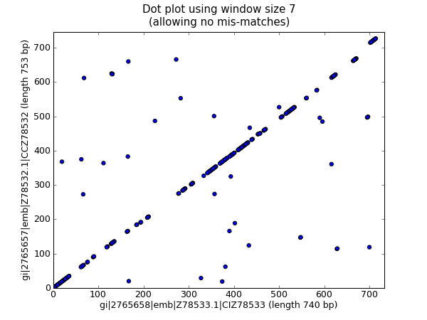上面的代码在小示例上运行良好,但将其应用于更大的序列会出现两个问题,我们将在下面解决这些问题。首先,这种针对所有比较的暴力方法非常缓慢。相反,我们将编译将窗口大小的子序列映射到它们的位置的字典,然后采用集合交集来查找在两个序列中找到的子序列。这会占用更多内存,但 much 快二是 plt.imshow() 该功能受其可以显示的矩阵大小限制。作为替代方案,我们将使用 plt.scatter() 功能
