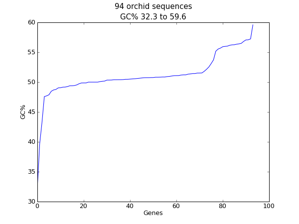"%i orchid sequences\nGC%% %0.1f to %0.1f"