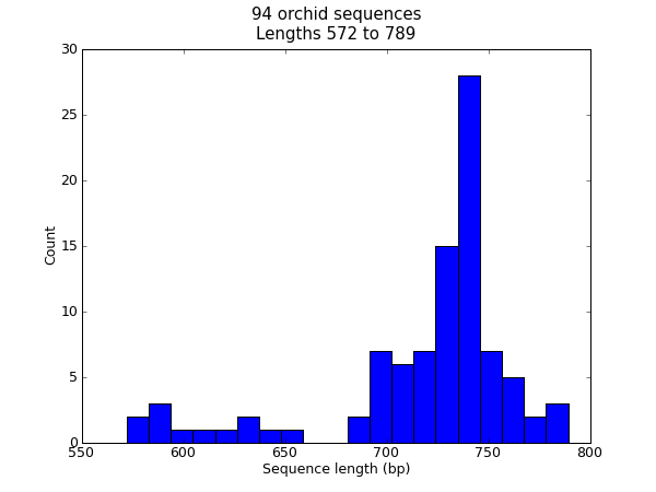 这应该会弹出一个新窗口,其中包含中所示的图表 图 22 .请注意,大多数兰花序列都是关于 \(740\) 碱基长,这里可能有两类不同的序列,其中有一个较短序列的子集。