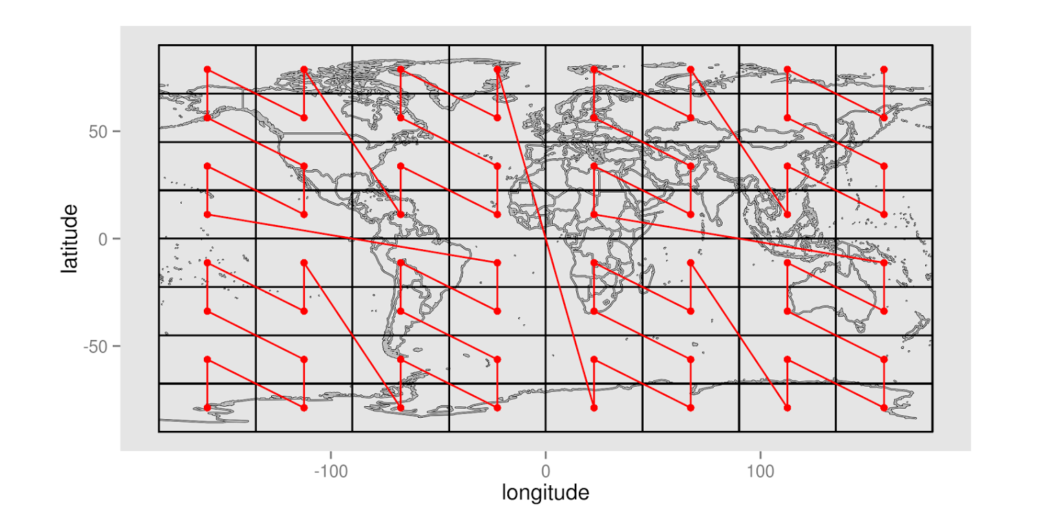 这条红线被称为空间填充曲线,或者更确切地说,是Z曲线。这行只访问每个单元格一次,从而建立了单元格的唯一顺序。