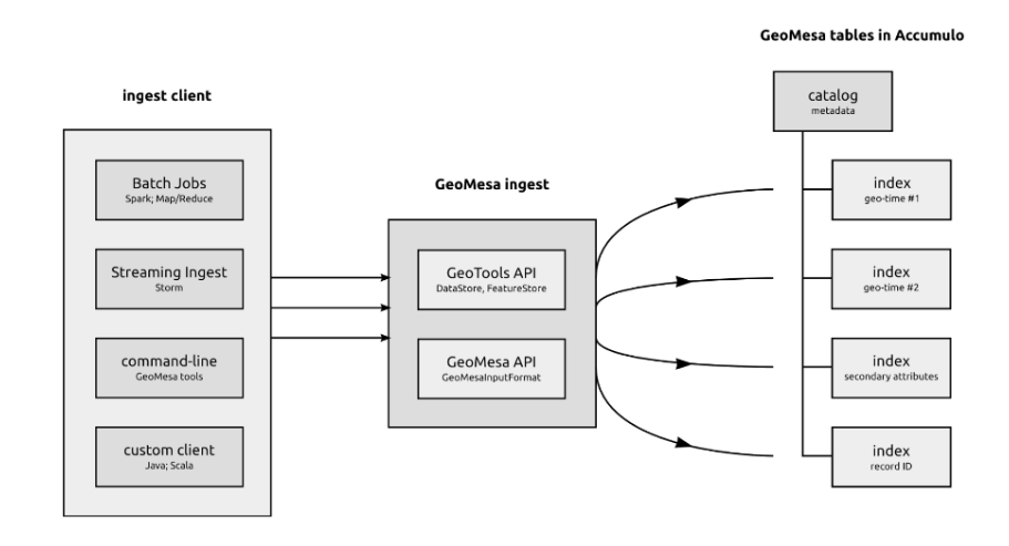 可以使用多个框架来流传输和批量摄取数据。这些工具包括GeoMesa命令行工具、使用ApacheHadoop的Map-Reduced作业,以及在ApacheStorm上运行的实时拓扑。下图显示了一种可能的接收体系结构: