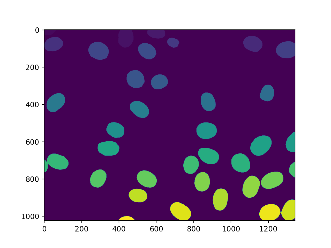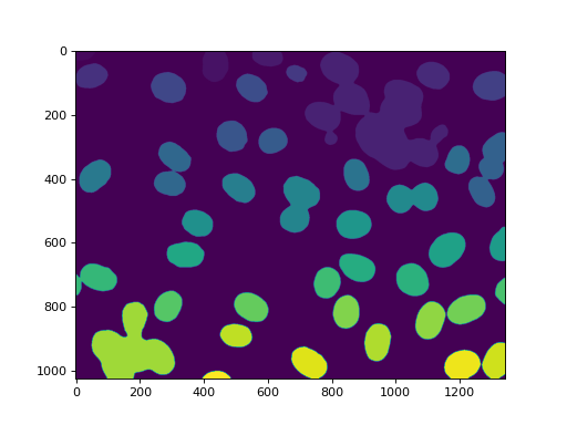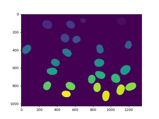 这个数组, labeled 现在具有范围内的值 0 至 n_nucleus ,但缺少某些值(例如,If Region 7 是接触边境的人之一,然后 7 未在标签中使用)。我们可以的 relabel 要获得更干净的版本::
