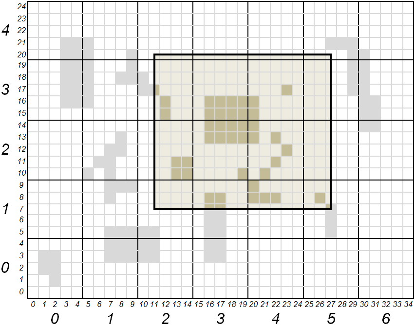 为了说明这个过程,这里有一个虚构的网格示例。瓷砖由网格上最小的正方形表示。每个25块的大正方形表示SQLite文件。小索引表示平铺坐标,而大索引表示数据库坐标。彩色矩形表示请求的缓存提取区域。较暗的平铺表示缓存中存在的平铺。