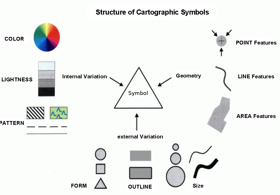 地图是使用点、线和区域符号的抽象表示。Bertin(1974)创建了一个清晰的逻辑符号方案,其中符号可以根据图形变量变化。MAPServer中可以使用以下图形变量:形状、大小、图案、颜色和亮度。点和区域符号以及文本字体(TTF)也可以用我们称之为轮廓的框架来显示。