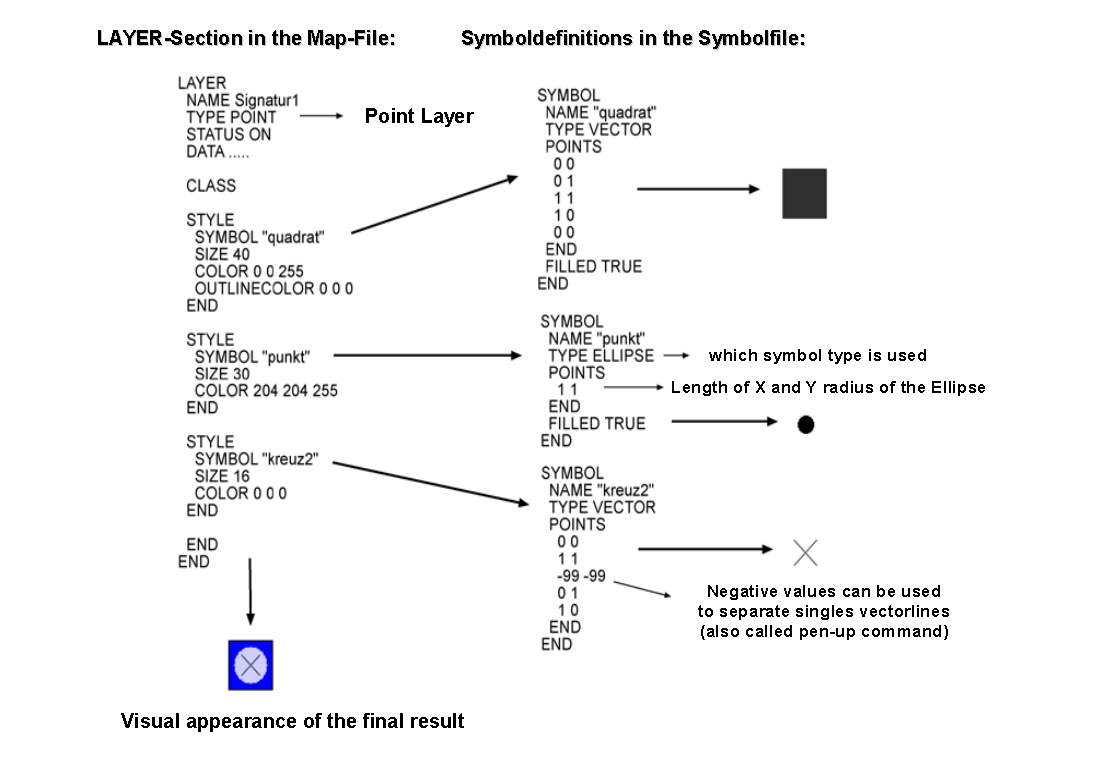 下面的示例显示了其中一些元素的交互,并解释了 LAYER 以及 SYMBOL 绘制绘图点符号所需的部分(红色方块,内有1像素宽的黑色轮廓和较小的蓝色圆圈):