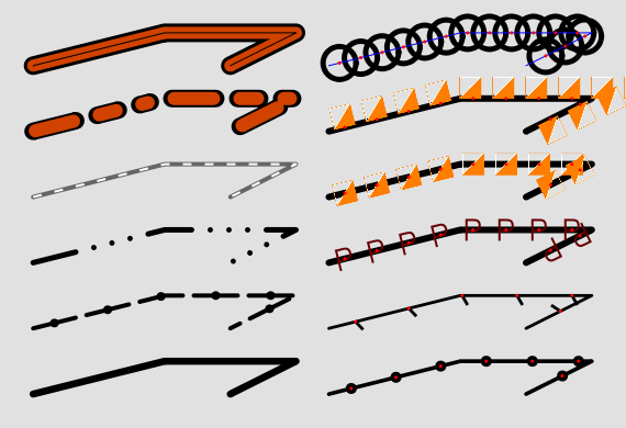 由于虚线机制(pattern)和符号在线放置机制(gap)不兼容,创建包含虚线的高级线条符号非常困难。解决办法可能是允许 GAP 要成为列表而不是单个数字(可能重命名为间隙或距离),但还需要引入一个新参数来指定到行上第一个符号的距离(在开发版本-6.2中实现了初始间隙)。