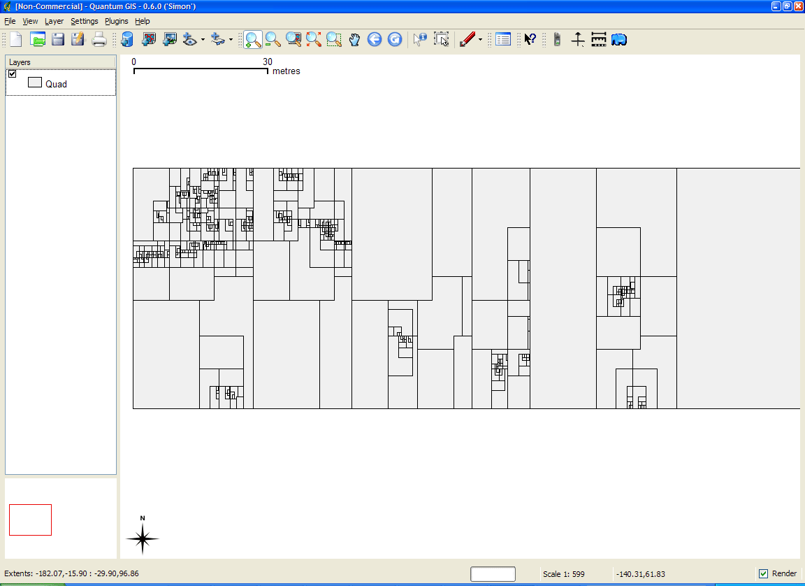 将创建名为“quad.shp”的形状数据集。现在可以在桌面GIS中查看此形状数据集(例如 QGIS 例如)查看使用shptree命令创建的四叉树,如下所示。