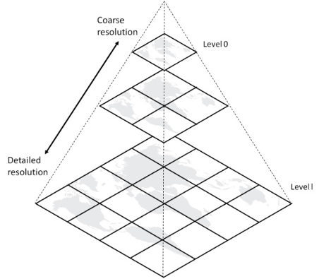 GeoPackage标准采用基于平铺的金字塔结构,用于以多分辨率存储图像和栅格地图。该结构的插图如下所示。