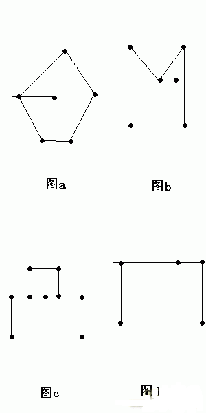 线 段在多边形内的一个必要条件是线段的两个端点都在多边形内,但由于多边形可能为凹,所以这不能成为判断的充分条件。如果线段和多边形的某条边内交(两线段 内交是指两线段相交且交点不在两线段的端点),因为多边形的边的左右两侧分属多边形内外不同部分,所以线段一定会有一部分在多边形外(见图a)。于是我们 得到线段在多边形内的第二个必要条件:线段和多边形的所有边都不内交。
