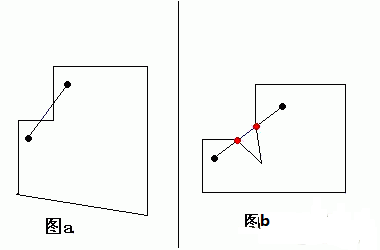 线段和多边形交于线段的两端点并不会影响线段是否在多边形内;但是如果多边形的某个顶点和线段相交,还必须判断两相邻交点之间的线段是否包含于多边形内部(反例见图b)。
