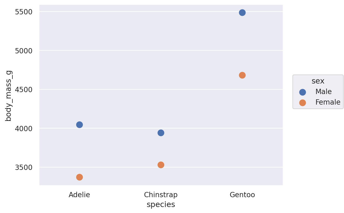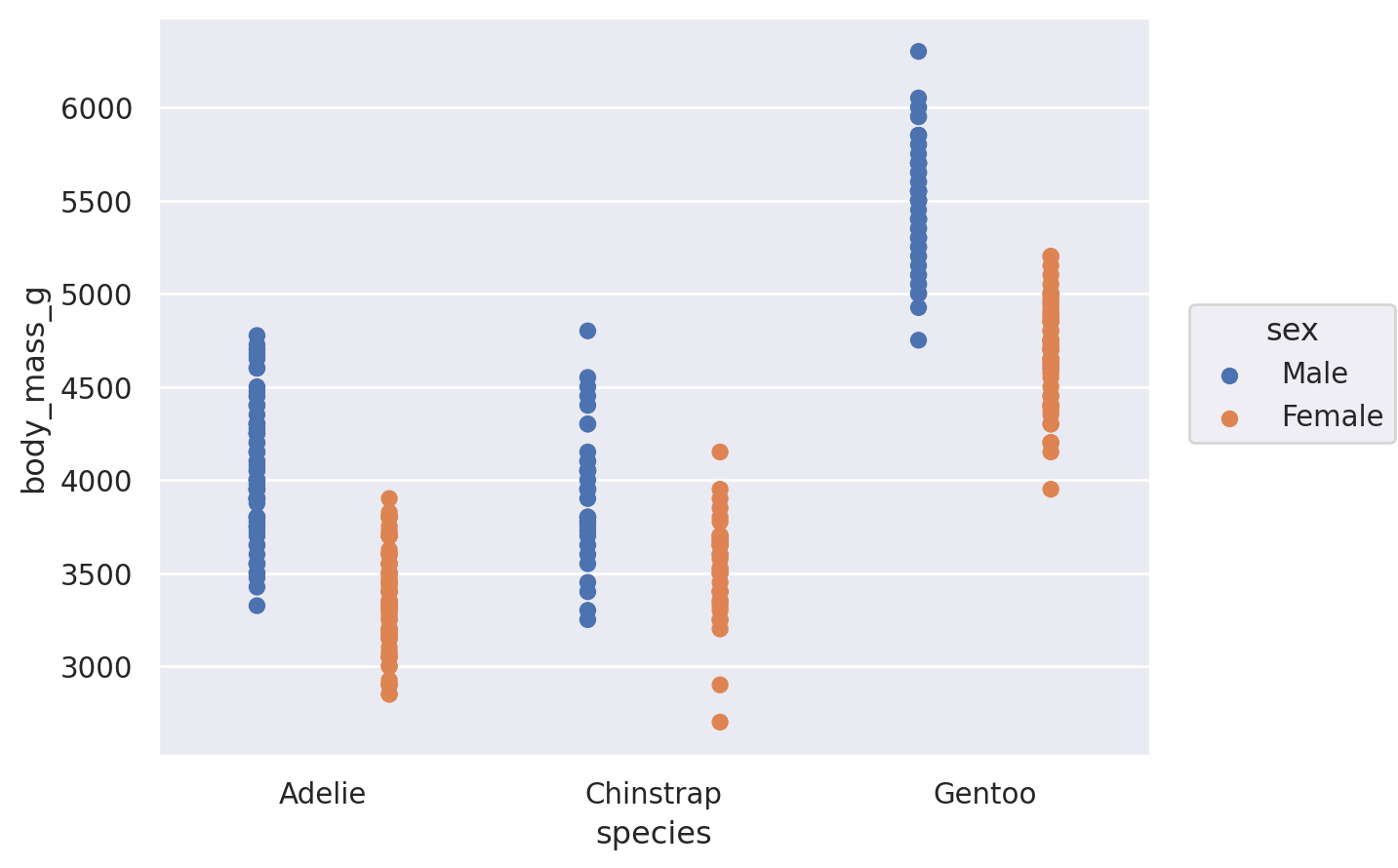 >>> so.Plot(penguins, x="species", y="body_mass_g", color="sex")