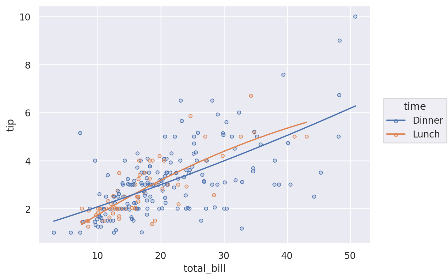 >>> so.Plot(tips, x="total_bill", y="tip", color="time")