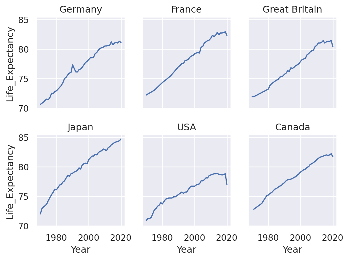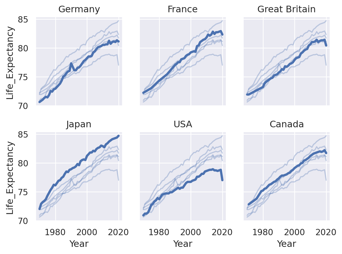 >>> so.Plot(healthexp, x="Year", y="Life_Expectancy", color="Country")