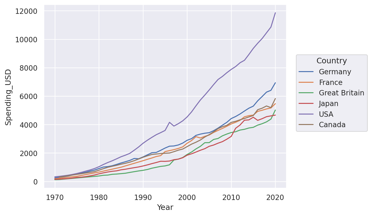 >>> p = so.Plot(healthexp, "Year", "Spending_USD", color="Country")