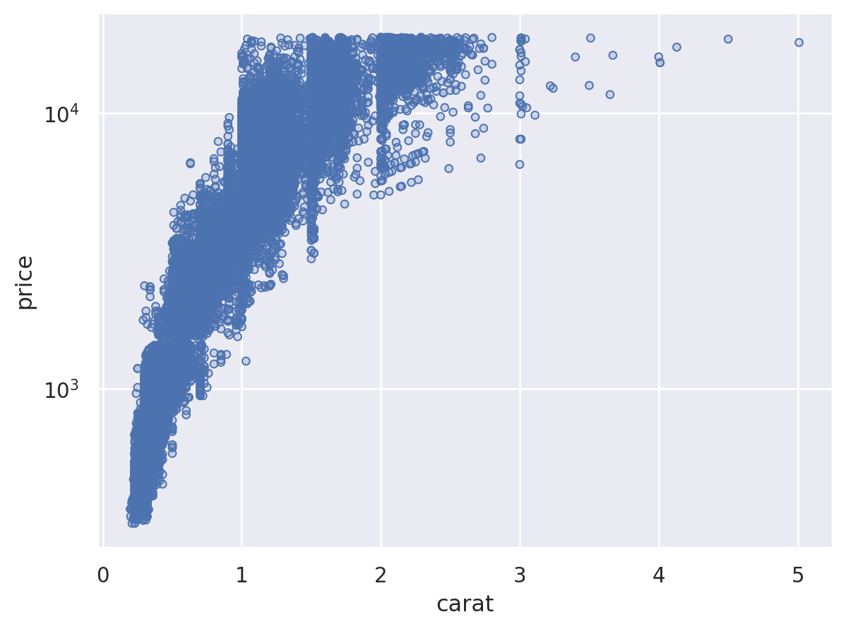 >>> so.Plot(diamonds, x="carat", y="price", color="carat")