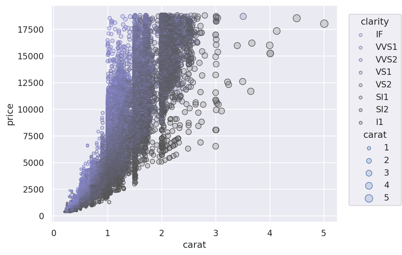 >>> so.Plot(diamonds, x="carat", y="price", color="clarity", pointsize="carat")