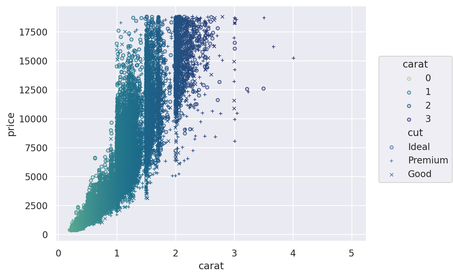 >>> so.Plot(diamonds, x="carat", y="price", color="carat", marker="cut")