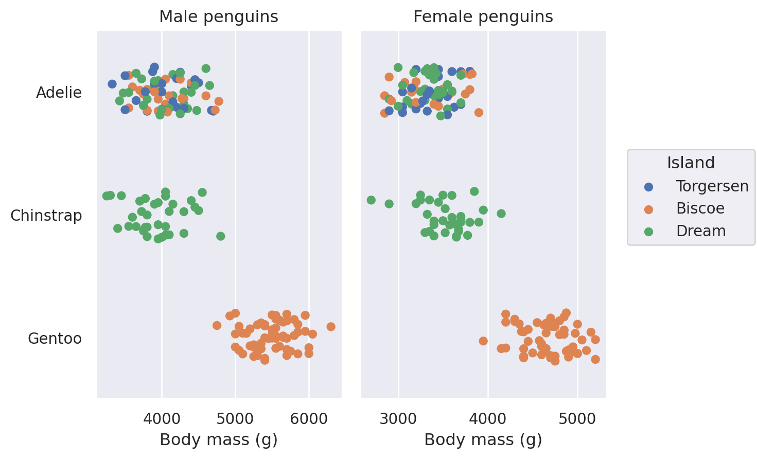 >>> so.Plot(penguins, x="body_mass_g", y="species", color="island")
