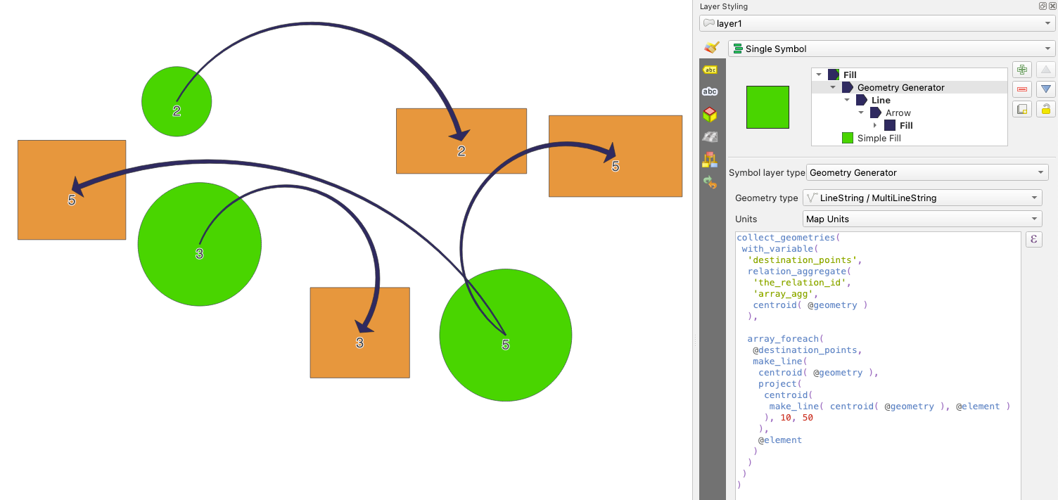 Available with all types of symbols, the geometry generator symbol layer allows to use expression syntax to generate a geometry on the fly during the rendering process. The resulting geometry does not have to match with the original Geometry type and you can add several differently modified symbol layers on top of each other.