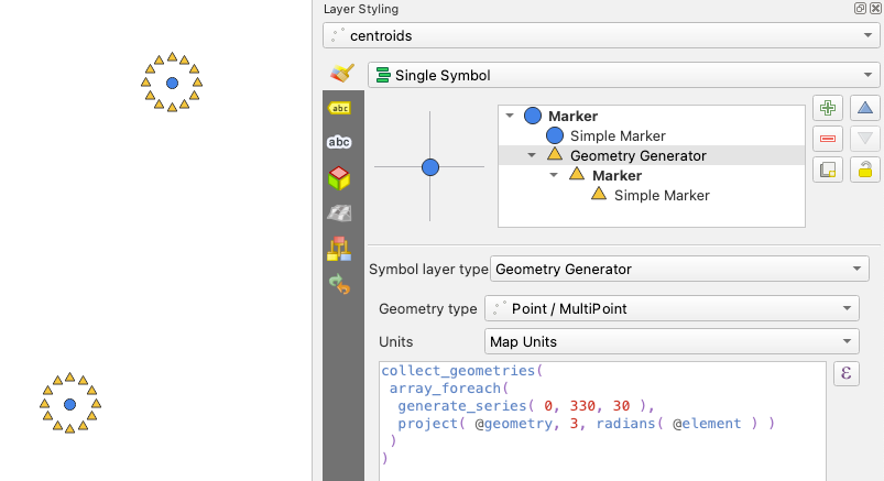 Create a radial effect of points surrounding the central feature point when used as a MultiPoint geometry generator