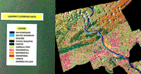 一个典型的土地覆盖和使用地图的例子,它源自陆地卫星图像,是这个多主题分类,覆盖了宾夕法尼亚州哈里斯堡周围的一个地区。城市位于分配给城市的突出黄色图案旁边。东部和西部较小的黄色斑点显示了一些市中心,如卡莱尔、赫尔希和黎巴嫩。这个大都市地区的人口超过30万,通常分布在哈里斯堡市范围之外。传说中的“森林砍伐”一类描述了第3节中审查过的同一种吉普赛蛾的落叶。