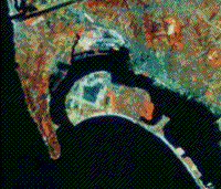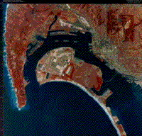 即使是由MSS图像创建的低分辨率子中心,也是显示城市区域主要特征的有效方式,例如街道模式、大型建筑、机场、休闲公园和一些工业设施。这种影响在1975年3月30日,加利福尼亚州最南端的圣地亚哥中部的MSS视图中是显而易见的。它显示了海湾港口、军事和民用机场、市中心、巴尔博亚公园、特派团海湾和卡布里洛角。