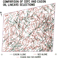 戈达德航天飞行中心的代码923中,包括这位作者在内的四位地质学家决定检查这些地图结果的再现性。每个人都使用与eason oil相同的透明胶片(主要是冬季图像),并且彼此独立工作,以最小化偏差。完成后,我们将跟踪记录登记到一张基础地图上,在该地图上还绘制了伊森石油线,如下所示。这一比较揭示了两组之间在差异方面存在相当惊人的差异。我们发现只有大约20%的线性特征是相同的。伊森石油公司选择了35%的可疑特征,而戈达德地质学家选择了剩下的45%,这代表了伊森石油公司“遗漏”的那些特征。我们立即怀疑,这种结果的部分原因是,在决定给定的线性特征a)是否真的存在,b)在性质上是地质的,c)意味着任何东西时,具有相当大的主观性。
