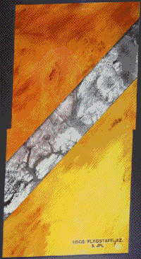 雷达脉冲的一个特性导致了1981年11月从SIR-A获得的一幅非凡的图像。下面的彩色场景是苏丹西北部撒哈拉沙漠中塞尔玛沙层的陆地卫星子图像。由于干沙具有较低的介电常数,雷达波可以穿透这些小颗粒几米(约10英尺)。向东北方向延伸的嵌入式雷达带实际上是在松散的冲积砂和砾石下面的一般深度处的基岩图像,看起来几乎看不见。它揭示了一个有沟的地下地形,山谷与镜面反射表面相关,高地显示为更亮。