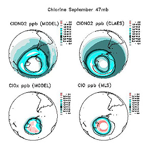 1991年9月12日,在航天飞机(STS-48)上部署了高层大气研究卫星(UARS),其中有10个仪器,包括微波翼发声器(MLS)、高分辨率多普勒成像仪(HRDI)和改进的平流层和中层发声器(ISAMS)。在接下来的图像中,顶部是根据MLS和低温柱阵标准具分光计(CLEAS)的预测模型和实际结果绘制的一氧化碳(CLO)和二氧化氮(NO:SUB:2)南极分布图。底部是甲烷(ch:sub:4)沿特定轨道在大气中分布的克莱斯图。