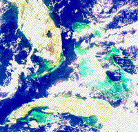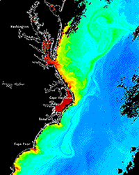 下一对图片是czcs颜色合成图:左边的图片强调在新英格兰海岸(bgr=3,2,1)附近的乔治河岸的叶绿素富集(红色),而右边的图片模拟自然海洋颜色(bgr=1,2,3)。