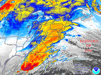 如果发生快速解冻,大暴风雪会造成严重覆盖,导致大面积洪水泛滥。看看1996年1月7日袭击美国东北部的一场大风暴的GOES-8覆盖范围(顶部,下方)。风暴经过和晴空返回后拍摄的底部图像显示了积雪的范围。