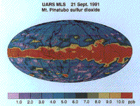 当火山爆发时,它会向大气中喷出数百万吨的火山灰、碎片和气体,更不用说一些火山喷出的熔岩了。由于地面、海洋表面和太空中存在仪器,我们观察到一团由Pinatubo排放的二氧化硫云(So:Sub:2`),向西移动,在最初喷发的12天内远远超过印度。到了三个月,那团云已经完全包围了地球,如图所示,在一年之内。2 大气中的粒子在全球范围内提供了色彩绚丽的日落,同时也降低了全球温度。显然,一座喷发的火山对更多的人和地方的影响,而不仅仅是在其附近。