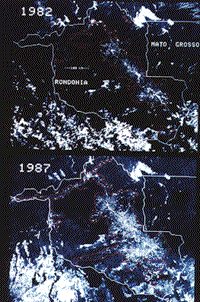 其他人类活动可能会提高全球变化率。现在引起人们注意的一项活动是森林砍伐,即人类砍伐和焚烧,或只是砍伐大片树木,以将土地用于农业,或将木材用于建造庇护所。随着开发商对这些大区域的剥削,生物多样性减少,土地利用、水径流模式和当地天气现象发生变化。卫星遥感已经产生了渐进式森林砍伐的戏剧性图像,这两个场景是由NOAA的AVHRR在巴西亚马逊河流域的隆多尼亚州所拍摄的,相隔五年。