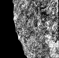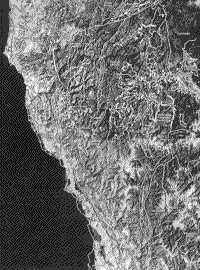 立体图像对应该减少这种偏见的影响。使用可倾斜的HRV扫描仪(见第3节)制作的两个点图像,在不同的日期指向不同的角度和方向,允许我们直接从图像中绘制脊线。这是一个(15米 [49英尺] 分辨率)全色图像(60 km [37密] 一侧),包括黄金海滩、皮克特峰和Sixes河和Yolla Bolly地体的部分: