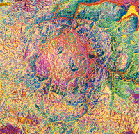 18-16: Using the Principal Components image, locate (approximately) the apparent boundary (eroded rim segment) of the Zhamanshin impact structure (now an astrobleme). `ANSWER <answers.html#18-16>`__