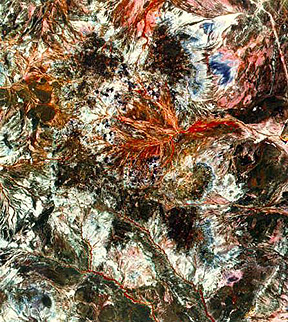 大多数撞击结构都受到了中度到严重的侵蚀,因此它们的环形山边缘形态不再是它们存在和性质的有力线索。磨损的火山口有时被称为 星虫 (字面意思是“星伤”)。因此,在空间图像中的检测是困难的;具有相关冲击变质特征的角砾岩是最佳指标。尽管如此,经过处理的图像仍能显示出星体的迹象(有时排水系统会根据底层结构进行调整,并趋向于圆形)。一个相对年轻(90万年)的撞击坑,Kazahkstan的Zhamashin结构(13公里;8英里),就是一个例子。首先检查这个陆地卫星假彩色合成物;你可能很难找到真正的陨石坑,因为尽管它年轻,但它已经被严重侵蚀。