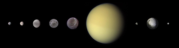 19-67: Now that you have been introduced to the saturnian satellites, let's see how well you can recall and identify each of the larger ones. Examine this montage gallery of 9 satellites and name each one. `ANSWER <answers.html#19-67>`__