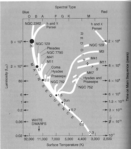 正如这张图所显示的,恒星在形成时经历了进化的变化,然后通过了它们的燃料燃烧循环。它们可以根据燃烧结束时的最终产物进一步分类;恒星演化的类型取决于H气体到达燃烧早期时的初始质量。恒星也可以根据其相对年龄分类为 人口I 和 人口二 类型。I型恒星通常较年轻,甚至在今天仍在形成。在旋涡星系中,它们最常见于旋臂中。II型恒星年龄较大,燃烧了大量的燃料,通常以螺旋形的形式存在于星系核心附近,或者是椭圆星系中的主要恒星。II型缺乏较重的元素(如后文所示,这些元素主要是在早期恒星的后期和爆炸性破坏中产生的),这意味着它们是在较年轻的宇宙中由尚未积累这些元素的原材料发展而来的。恒星的总生命中有90%都是在主序列上度过的。