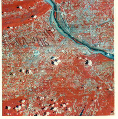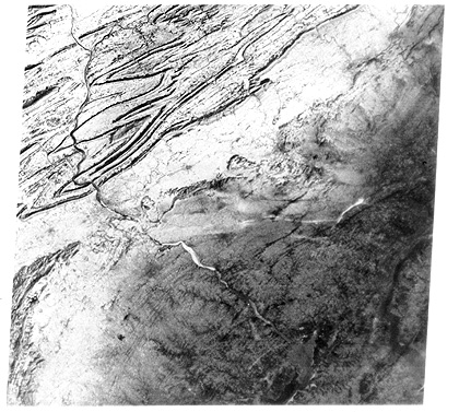 `**1-13:** <>`__ **Compare this subscene with the RB-57 photo, noting what can be found in both and what is not "seeable" in the Landsat version. ANSWER **